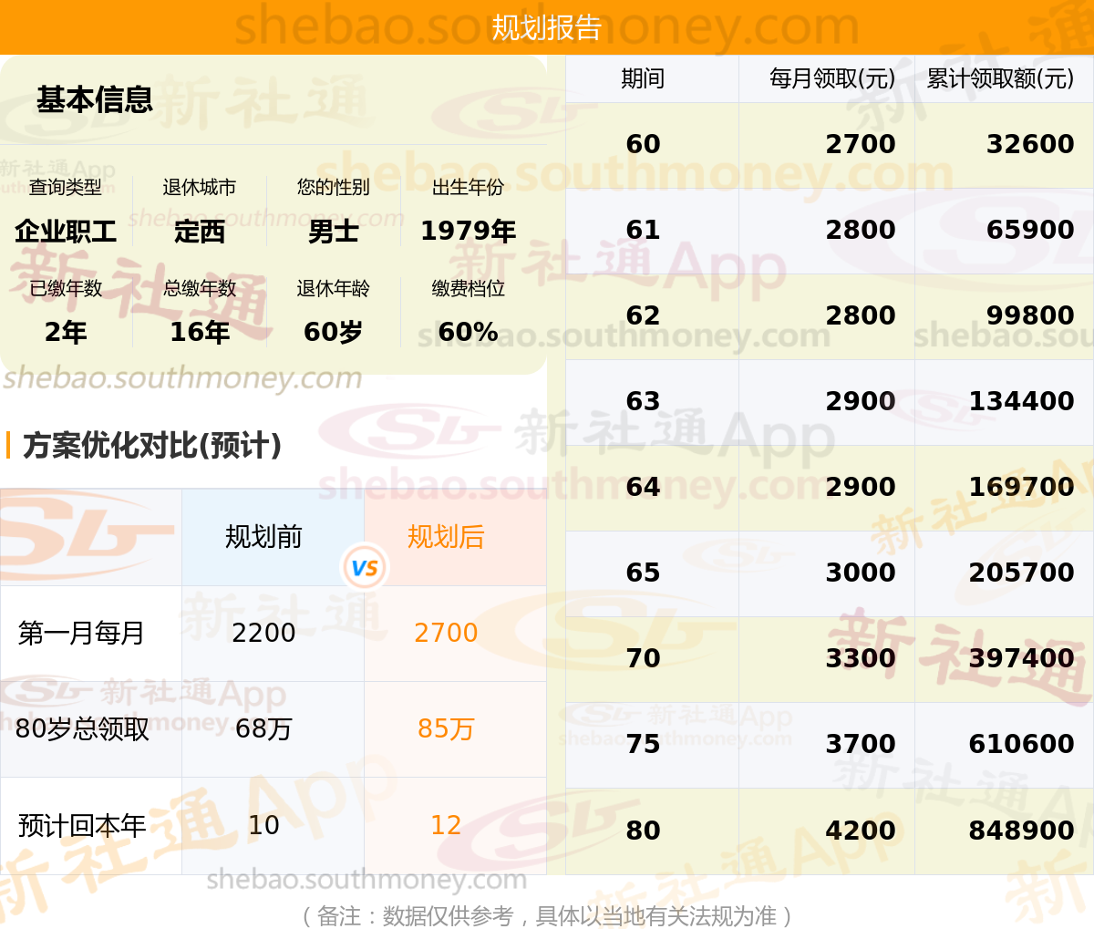 规划前:60岁第一个月约领2200元,新社通APP-养老金规划后:60岁第一个月约领2700元