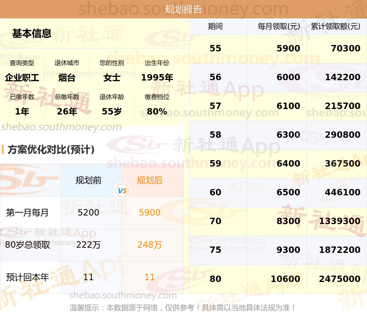 规划前:55岁退休后约领5200元,新社通APP-养老金规划后:55岁退休后约领5900元