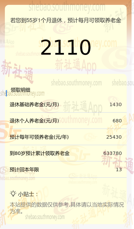 新社通app养老金计算器所得出,每月领取2110元养老金。