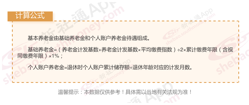 基础养老金= (养老金计发基数+养老金计发基数x平均缴费指数) ÷2×缴费年限×1%≈2950元