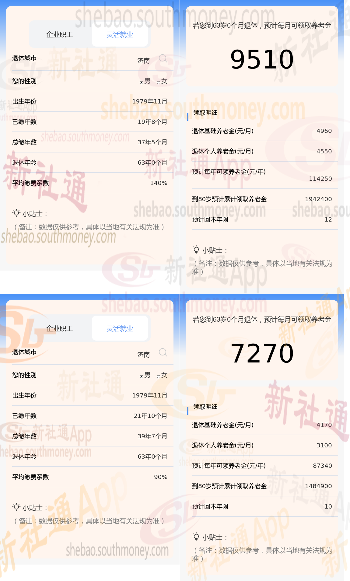 谢某:退休城市济南,社保缴费年限37年,63周岁退休,按140%缴费档位。