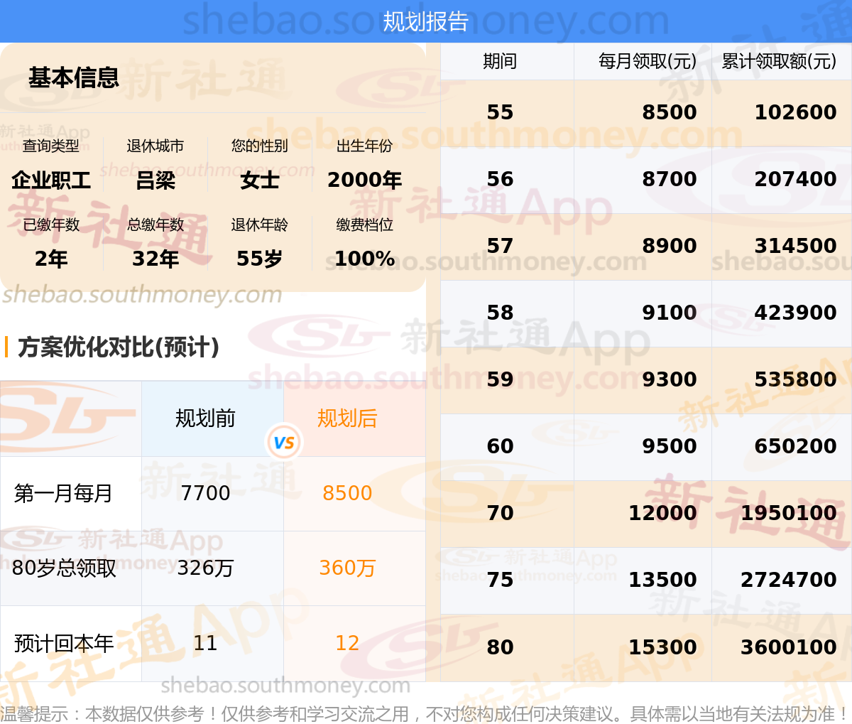 规划前:55岁退休后约领7700元,新社通APP-养老金规划后:55岁退休后约领8500元