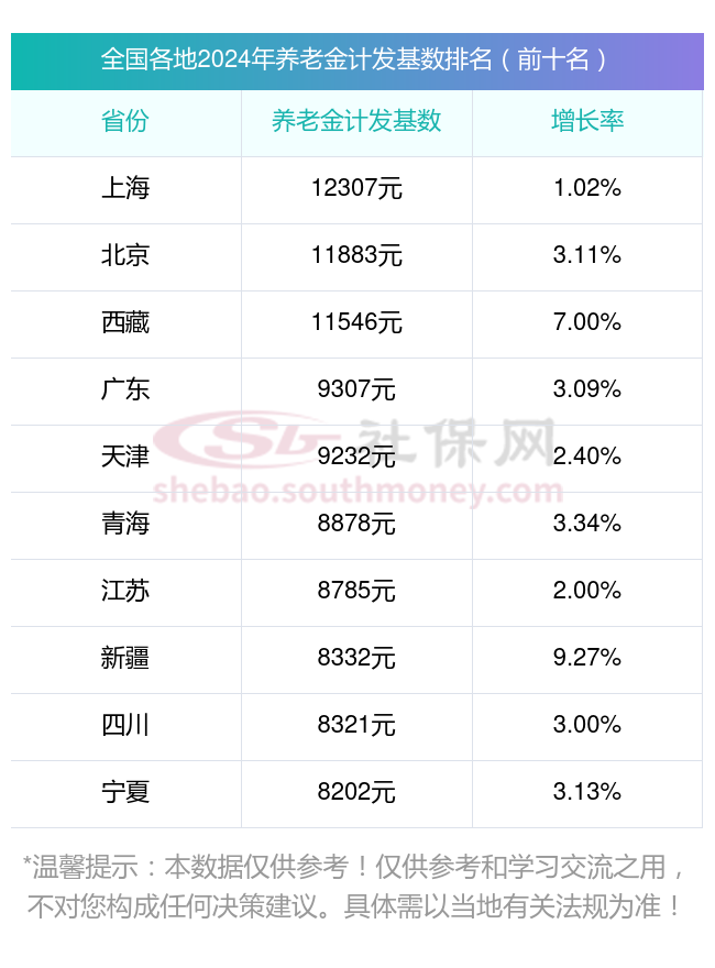 据新社通app显示,2024年上海位列第一位,养老金计发基数达到12307.00元;北京排名第二,养老金计发基数为11883.00元;西藏排名第三,养老金计发基数11546.00元。排名前10的还有:广东、天津、青海、江苏、湖北、新疆、四川。