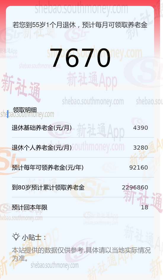 新社通app养老金计算器测算得出养老金可领取: