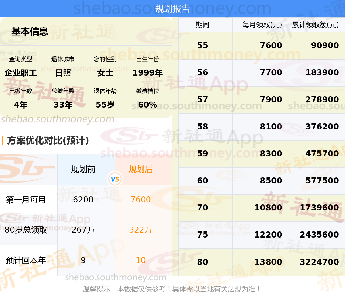 规划前:55岁第一个月约领6200元,新社通APP-养老金规划后:55岁第一个月约领7600元