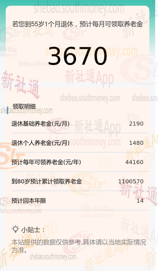 每月可领养老金总额:将基础养老金与个人养老金相加,每月可领取的养老金总额约为3670元(2190元+1480元)。