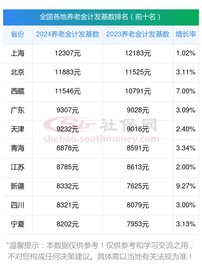 下面看看2023-2024年全国各地养老金计发基数排名前十