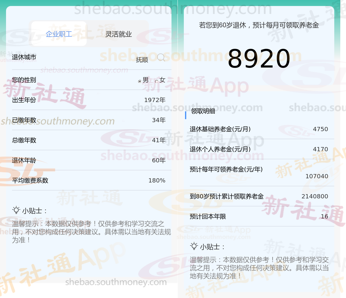 通过新社通APP-养老金计算所得:退休城市、出生年份、退休年龄、缴费系数都相同的情况下,社保缴费年限累计41年时,计算如下: