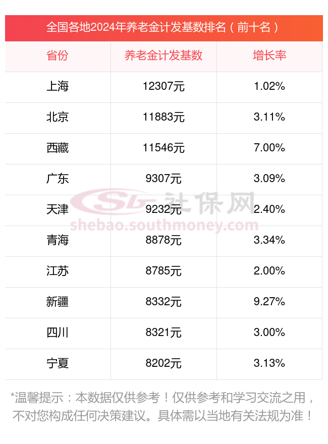 据新社通app显示,下面来看看全国各地2024年养老金计发基数一览表(前十名)
