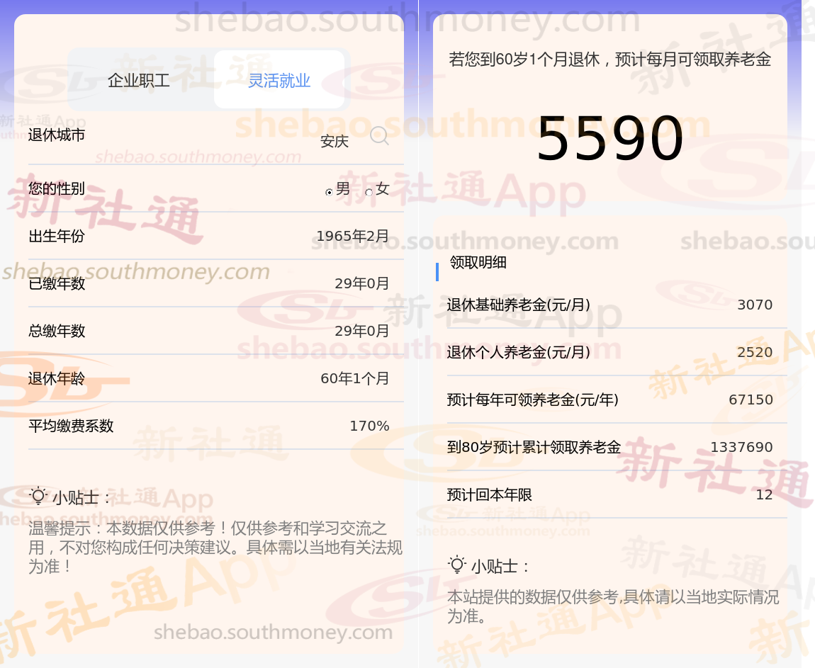 退休城市:安徽安庆,性别:男,出生年份:1965,总缴年数29年,缴费档次:170%,新社通app养老金计算器所得:
