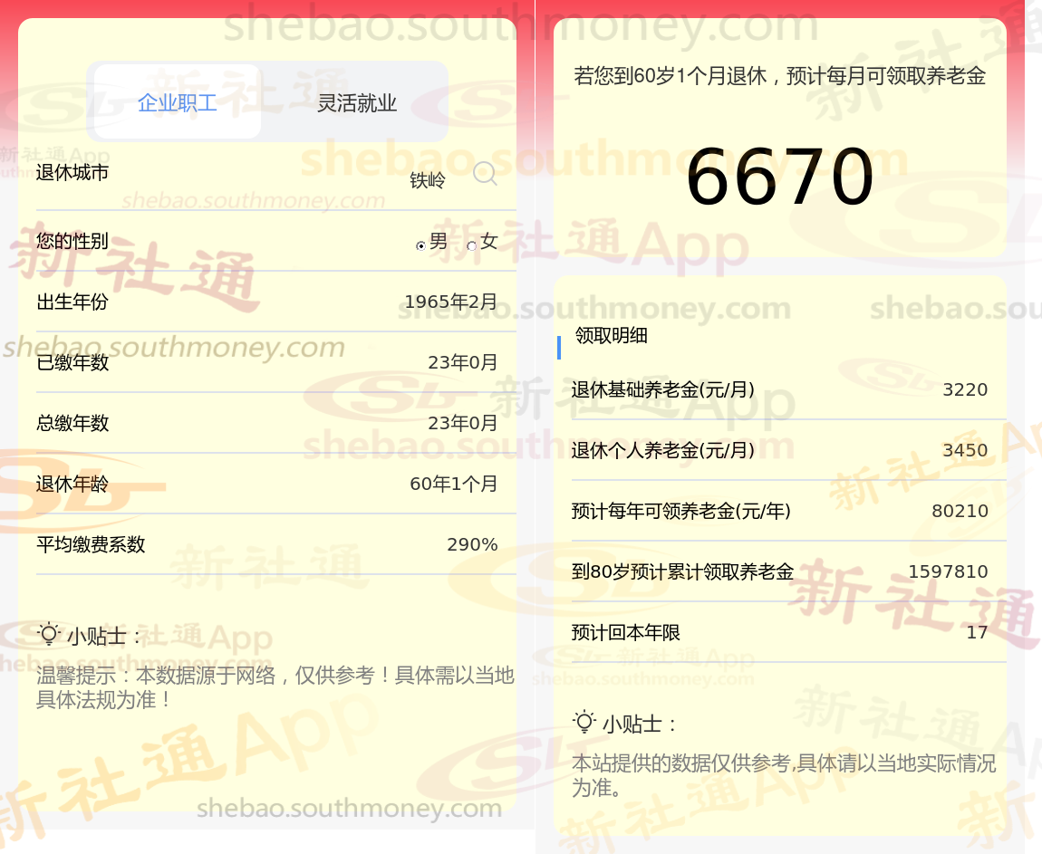 个人档案:男性,1965年出生,铁岭退休职工,社保缴费23载,档次290%。