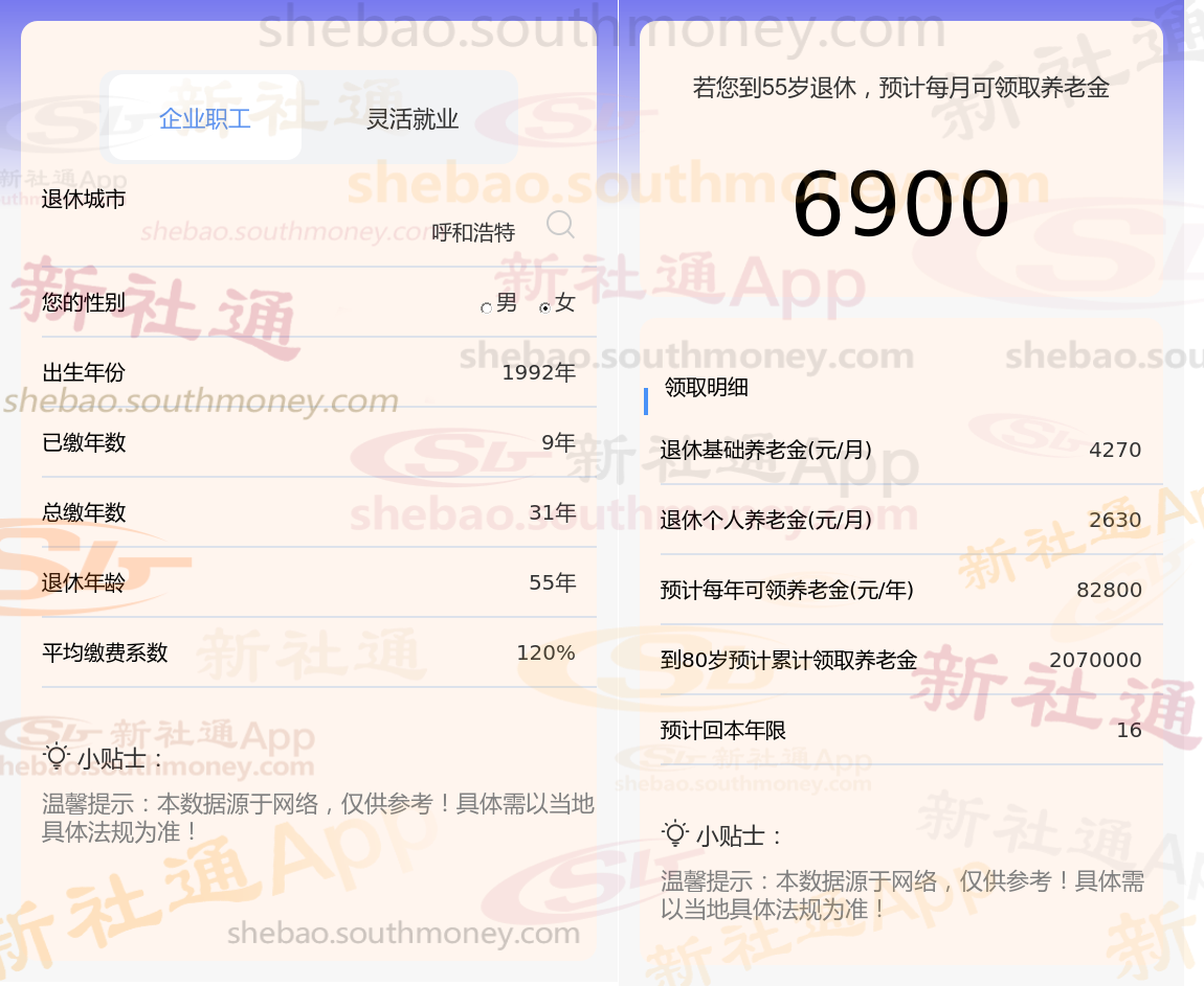 通过新社通APP-养老金计算所得:退休城市、出生年份、退休年龄、缴费系数都相同的情况下,社保缴费年限累计31年时,计算如下: