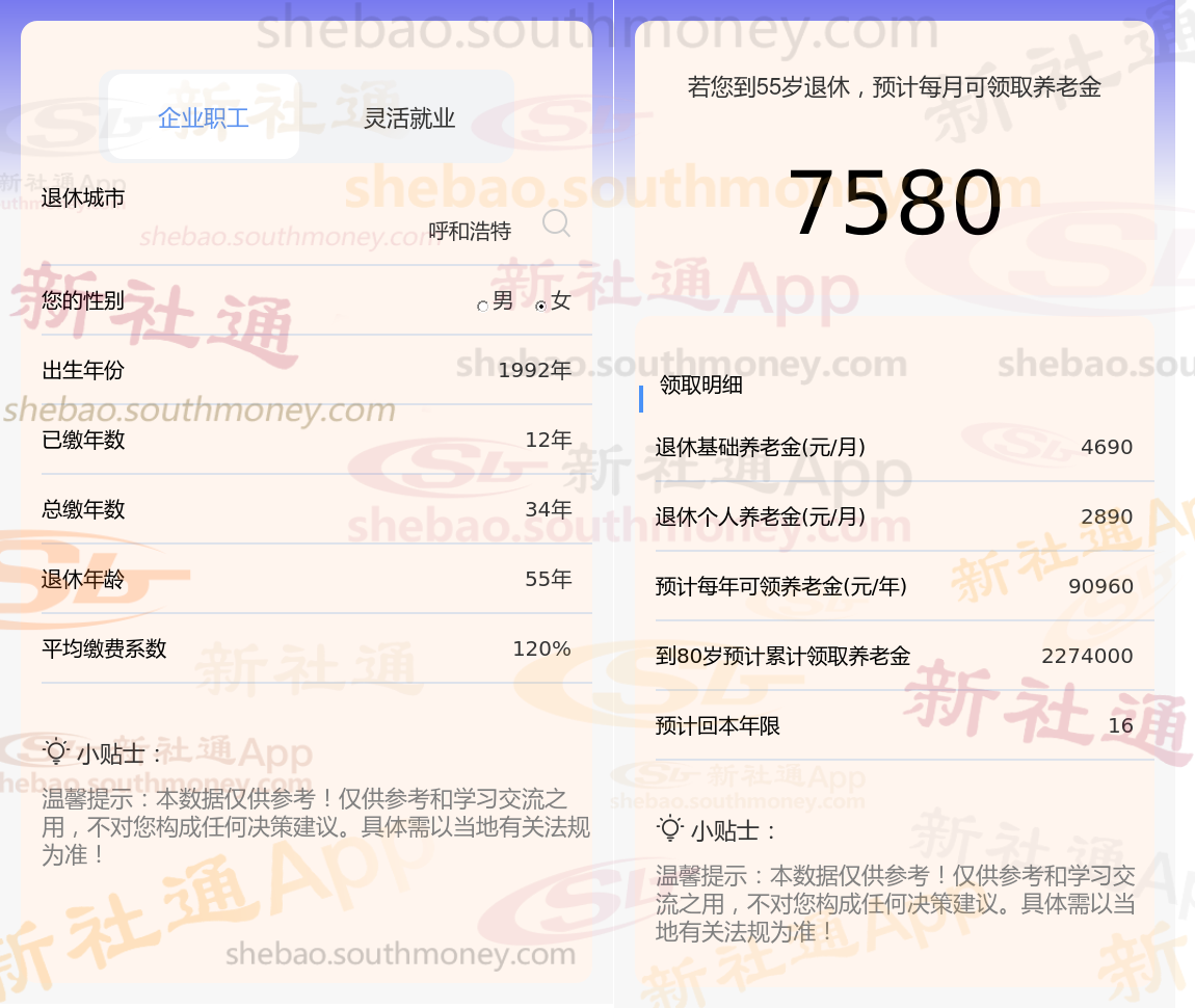 通过新社通APP-养老金计算所得:退休城市、出生年份、退休年龄、缴费系数都相同的情况下,社保缴费年限累计34年时,计算如下: