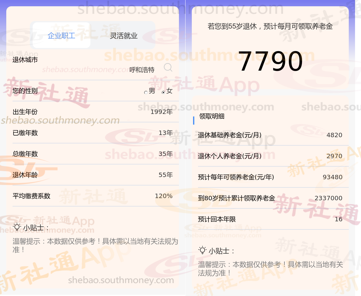 通过新社通APP-养老金计算所得:退休城市、出生年份、退休年龄、缴费系数都相同的情况下,社保缴费年限累计35年时,计算如下: