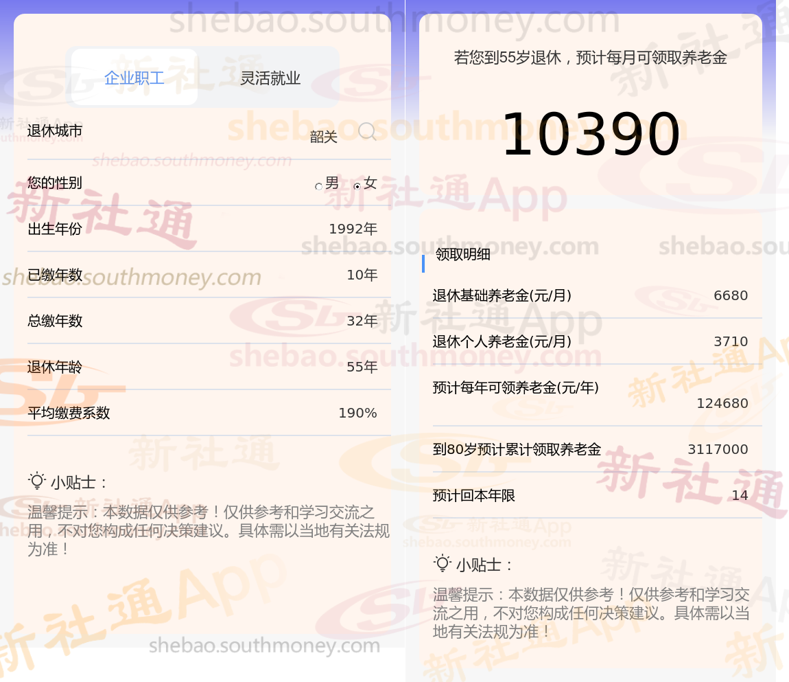 通过新社通APP-养老金计算所得:退休城市、出生年份、退休年龄、缴费系数都相同的情况下,社保缴费年限累计32年时,计算如下: