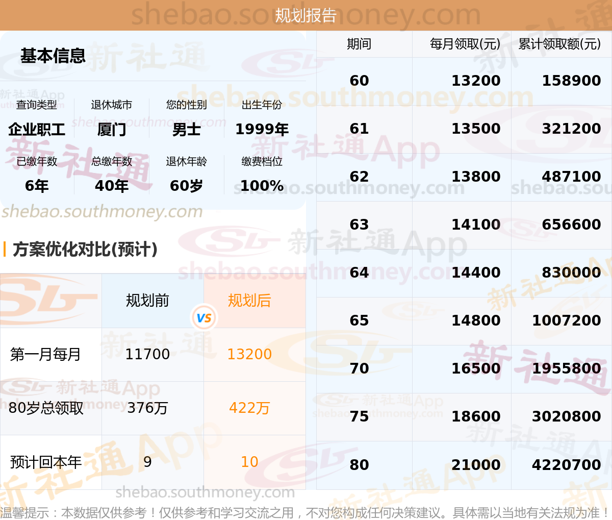 规划前:60岁第一个月约领11700元,新社通APP-养老金规划后:60岁第一个月约领13200元