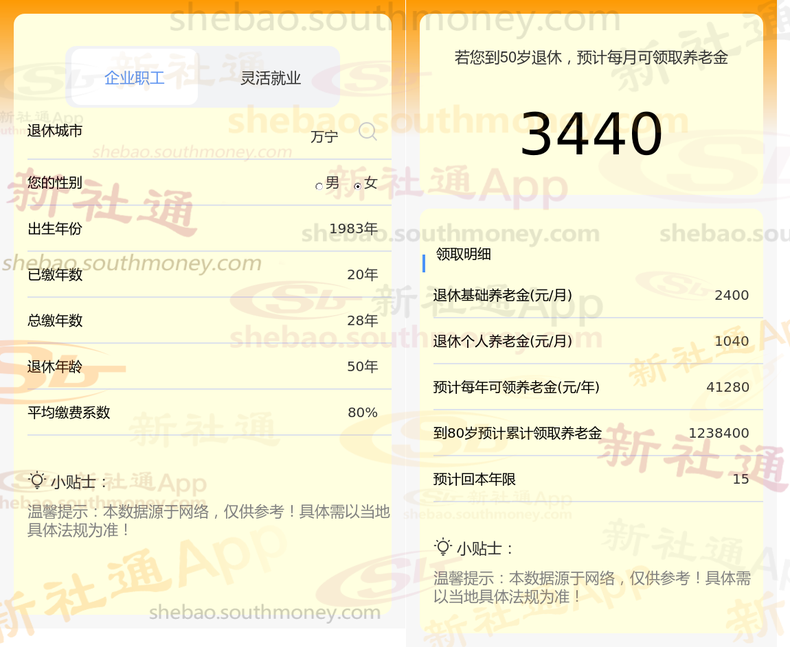 通过新社通APP-养老金计算所得:退休城市、出生年份、退休年龄、缴费系数都相同的情况下,社保缴费年限累计28年时,计算如下: