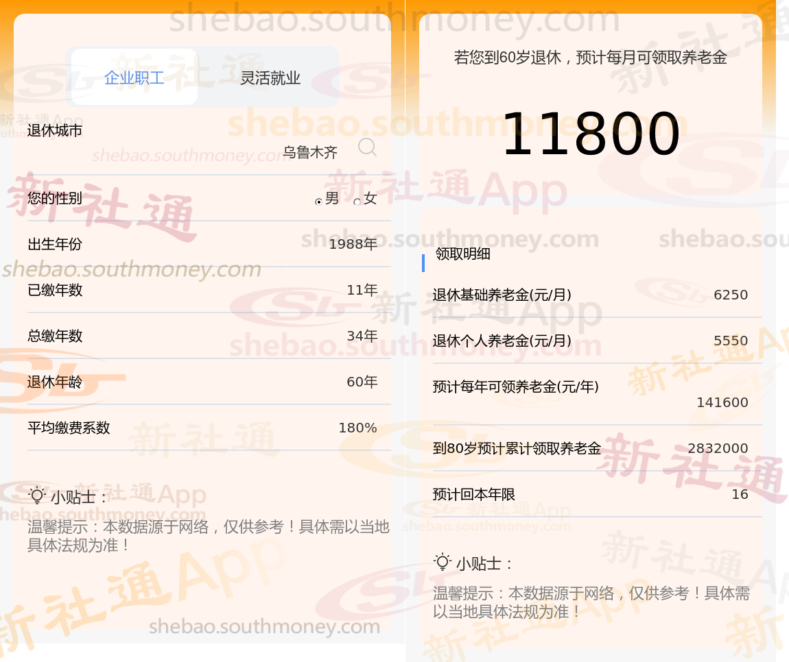 通过新社通APP-养老金计算所得:退休城市、出生年份、退休年龄、缴费系数都相同的情况下,社保缴费年限累计34年时,计算如下: