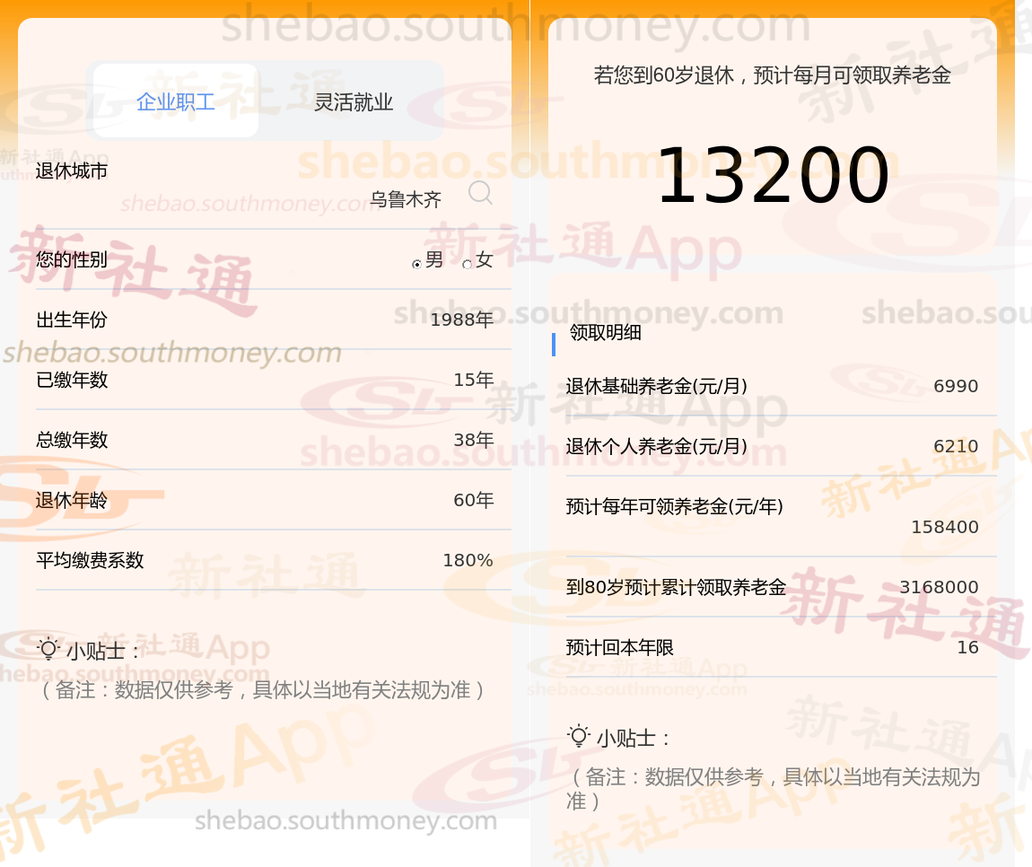 通过新社通APP-养老金计算所得:退休城市、出生年份、退休年龄、缴费系数都相同的情况下,社保缴费年限累计38年时,计算如下: