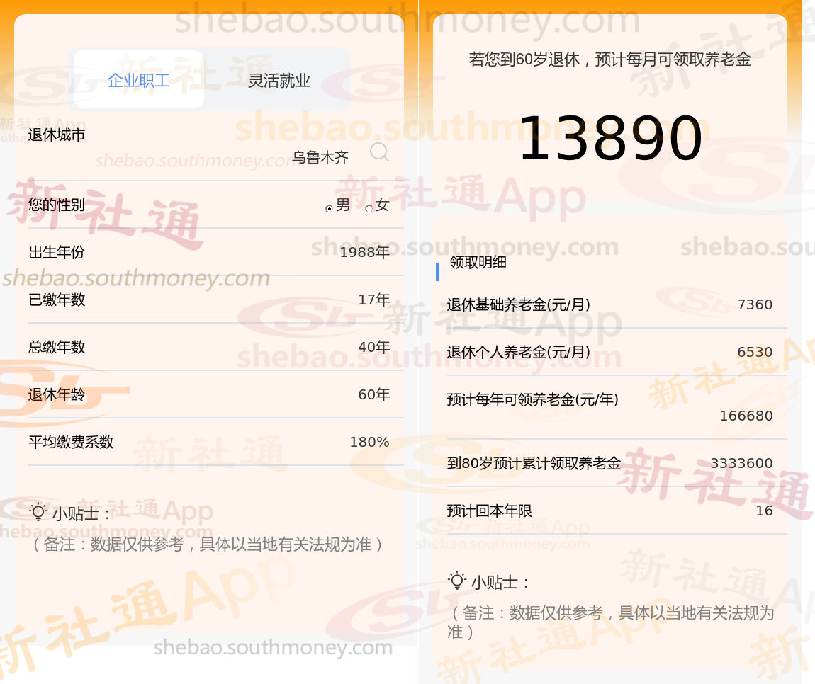 通过新社通APP-养老金计算所得:退休城市、出生年份、退休年龄、缴费系数都相同的情况下,社保缴费年限累计40年时,计算如下: