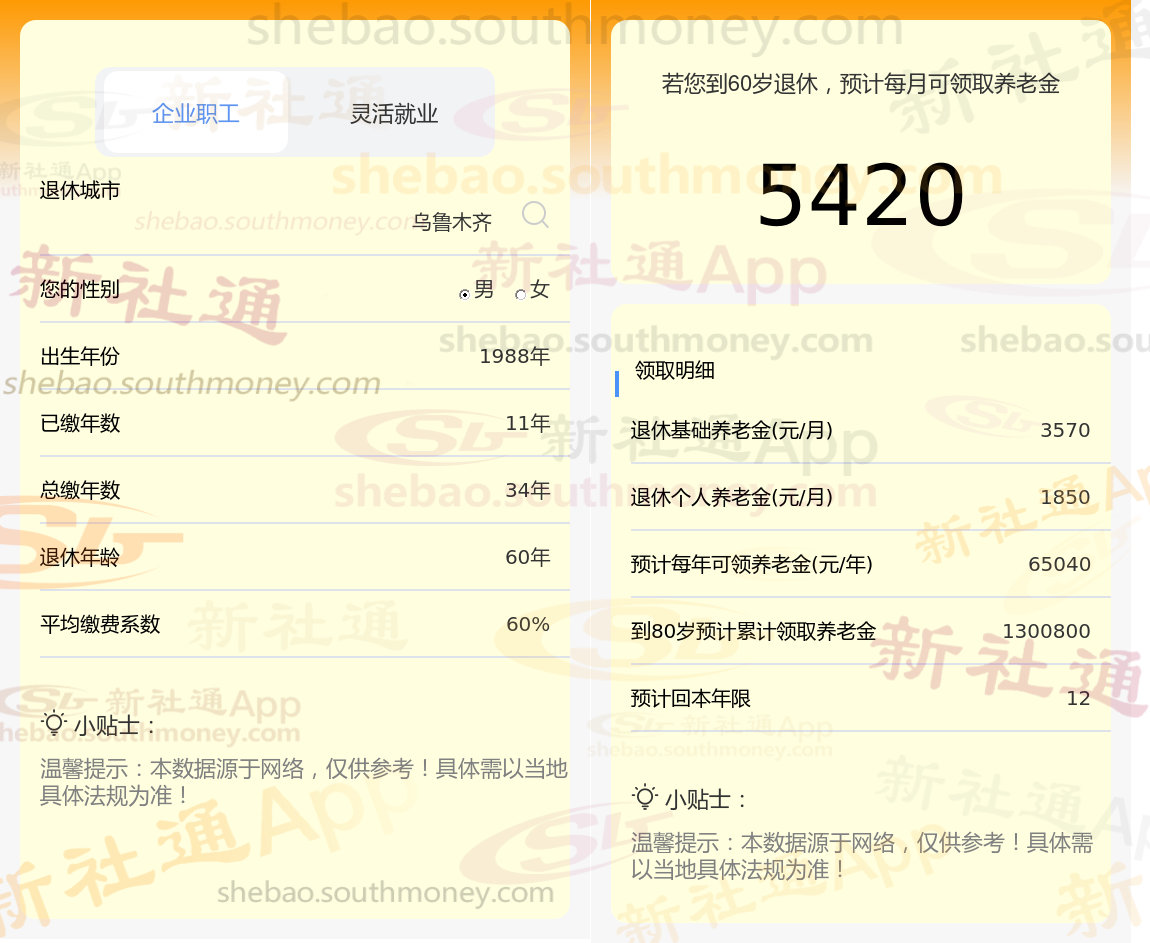 通过新社通APP-养老金计算所得:退休城市、出生年份、退休年龄、缴费系数都相同的情况下,社保缴费年限累计34年时,计算如下: