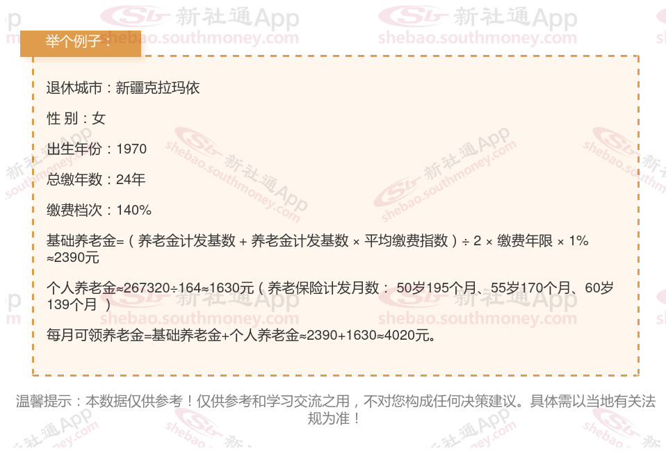 退休城市:新疆克拉玛依,性别:女,出生年份:1970,总缴年数24年,缴费档次:140%