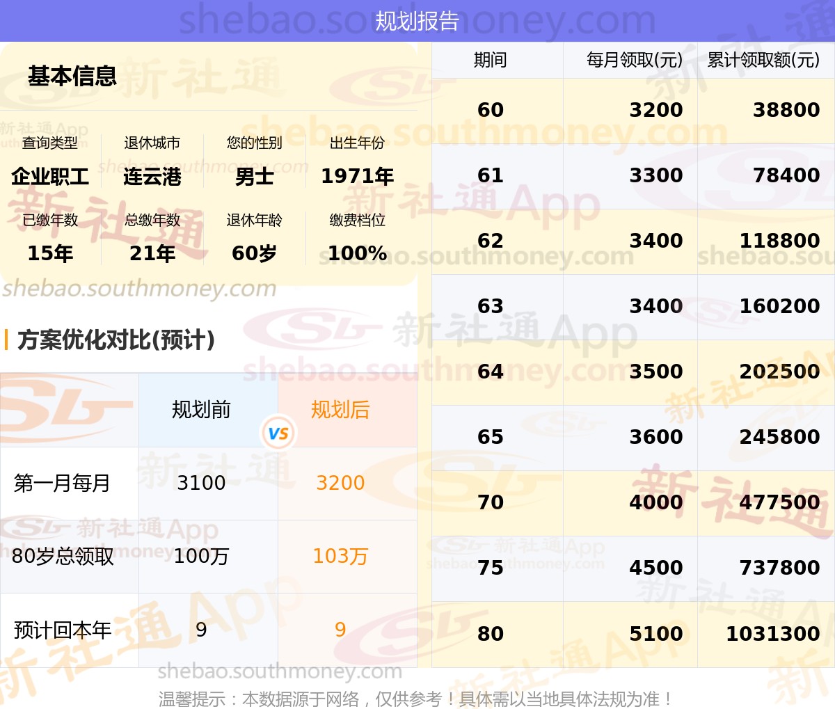 规划前:60岁第一个月约领3100元,新社通APP-养老金规划后:60岁第一个月约领3200元