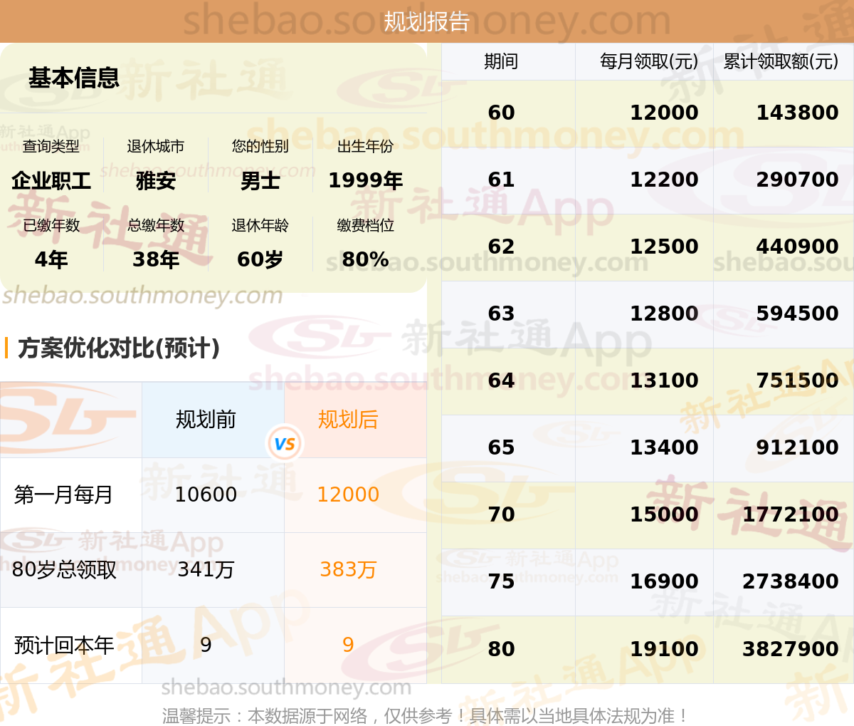 参保城市:雅安,性别:男士,出生年月:1999,已缴年限:4年,总缴年数:38年,退休年龄:60岁,缴费档位:80%。