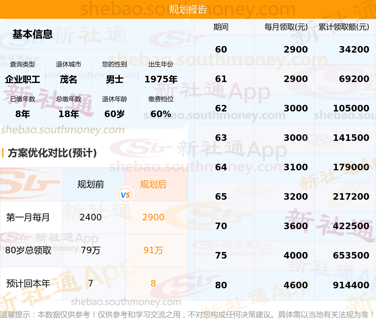 规划前:60岁第一个月约领2400元,新社通APP-养老金规划后:60岁第一个月约领2900元