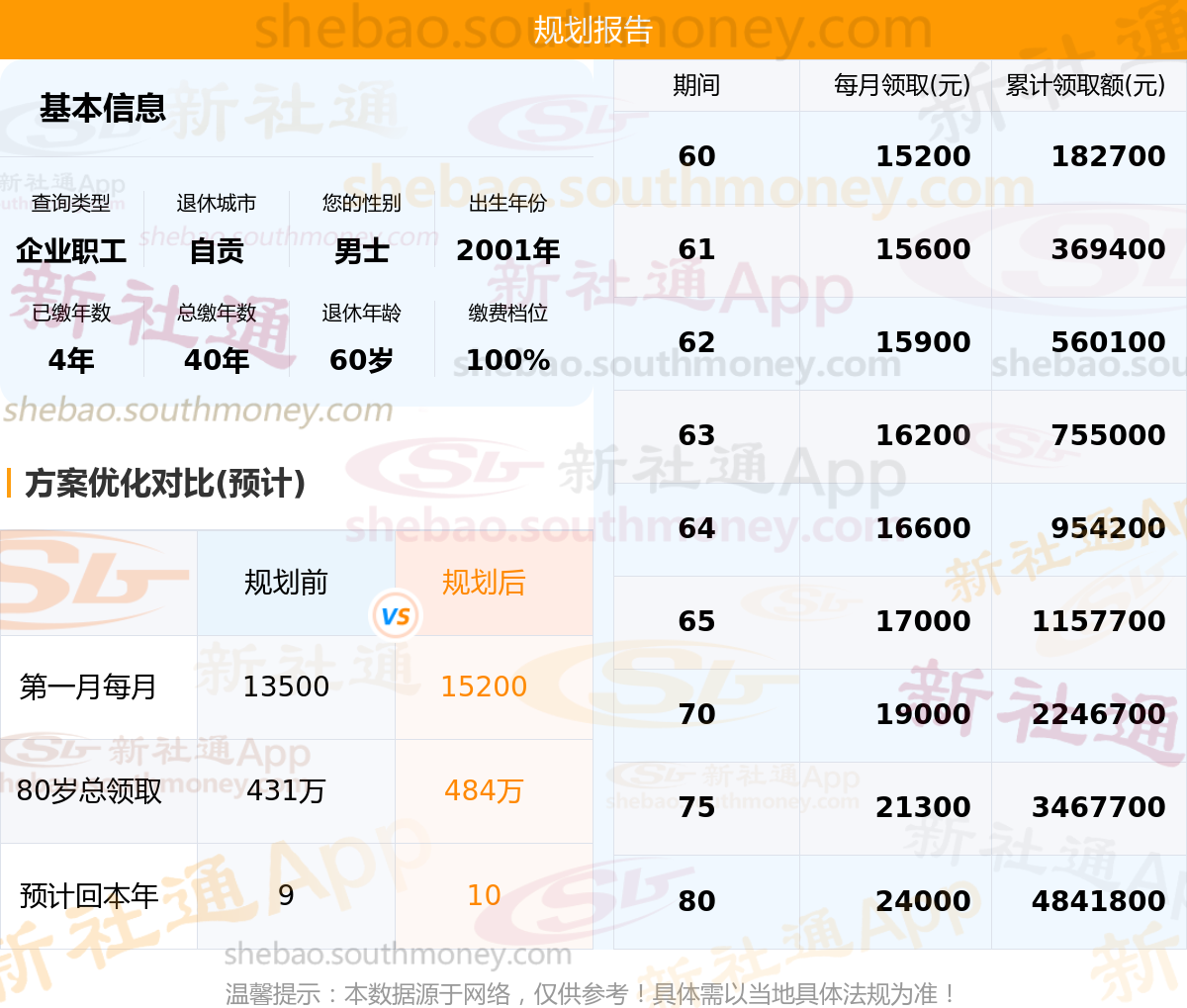 规划前:60岁每月约领13500元,新社通APP-养老金规划后:60岁每月约领15200元