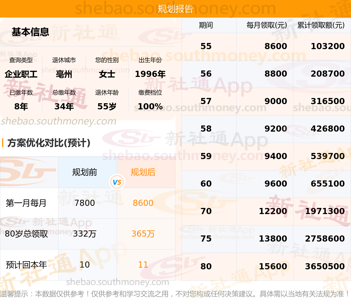 规划前:55岁第一个月约领7800元,新社通APP-养老金规划后:55岁第一个月约领8600元