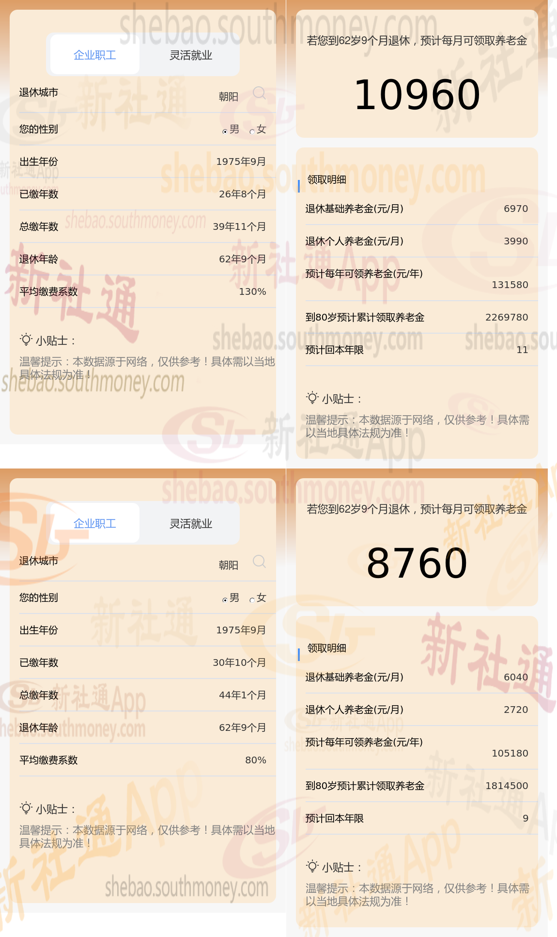 康某:退休城市朝阳,社保缴费年限39年,62周岁退休,按130%缴费档位。