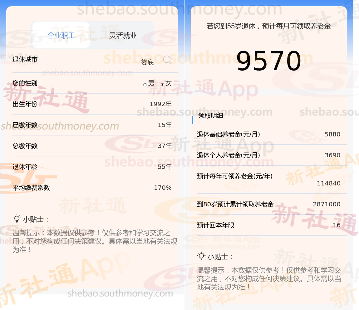 通过新社通APP-养老金计算所得:退休城市、出生年份、退休年龄、缴费系数都相同的情况下,社保缴费年限累计37年时,计算如下: