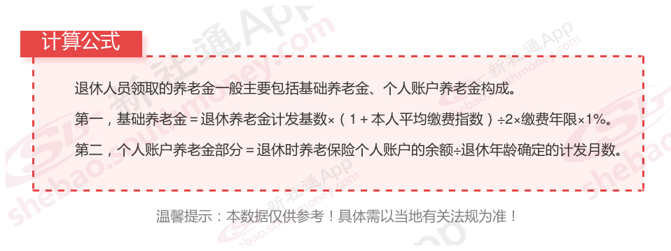 基本养老金计算公式为:(退休时上年度全市城镇单位就业人员月平均工资+本人指数化月平均缴费工资)÷2×缴费年限×1%。