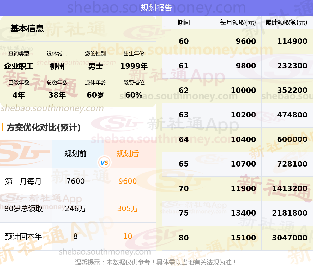 规划前:参保城市:柳州,性别:男士,出生年月:1999,已缴年限:4年,总缴年数:38年,退休年龄:60岁,缴费档位:60%。