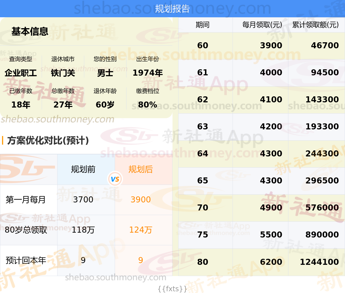 规划前:参保城市:铁门关,性别:男士,出生年月:1974,已缴年限:18年,总缴年数:27年,退休年龄:60岁,缴费档位:80%。