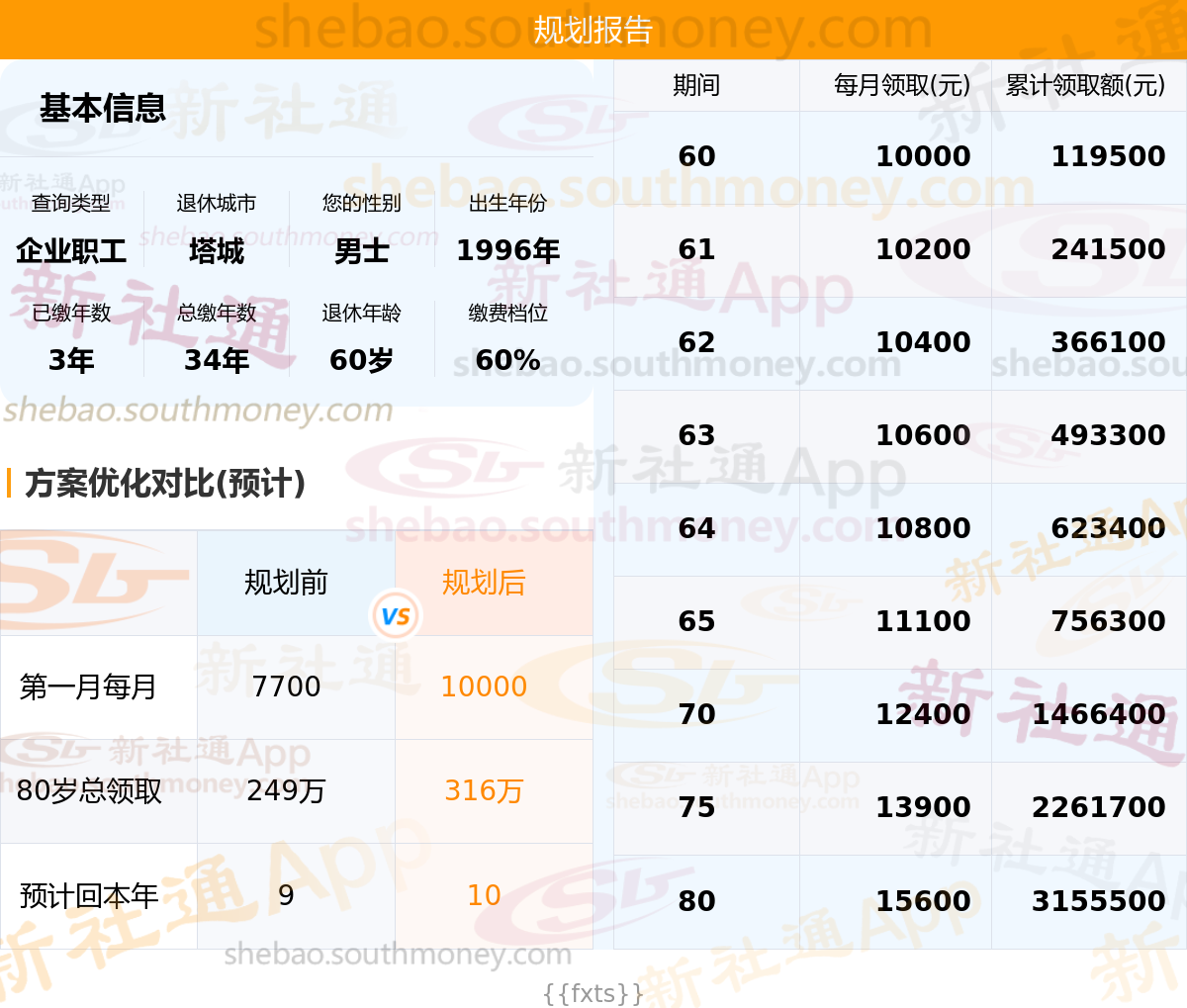 规划前:60岁第一个月约领7700元,新社通APP-养老金规划后:60岁第一个月约领10000元