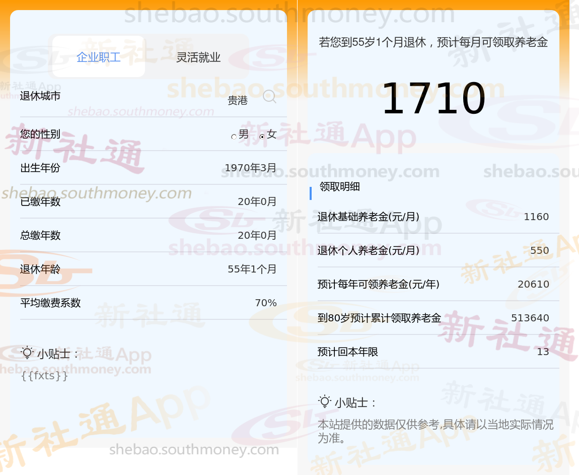退休城市:广西贵港,性别:女,出生年份:1970,总缴年数20年,缴费档次:70%,新社通app养老金计算器所得: