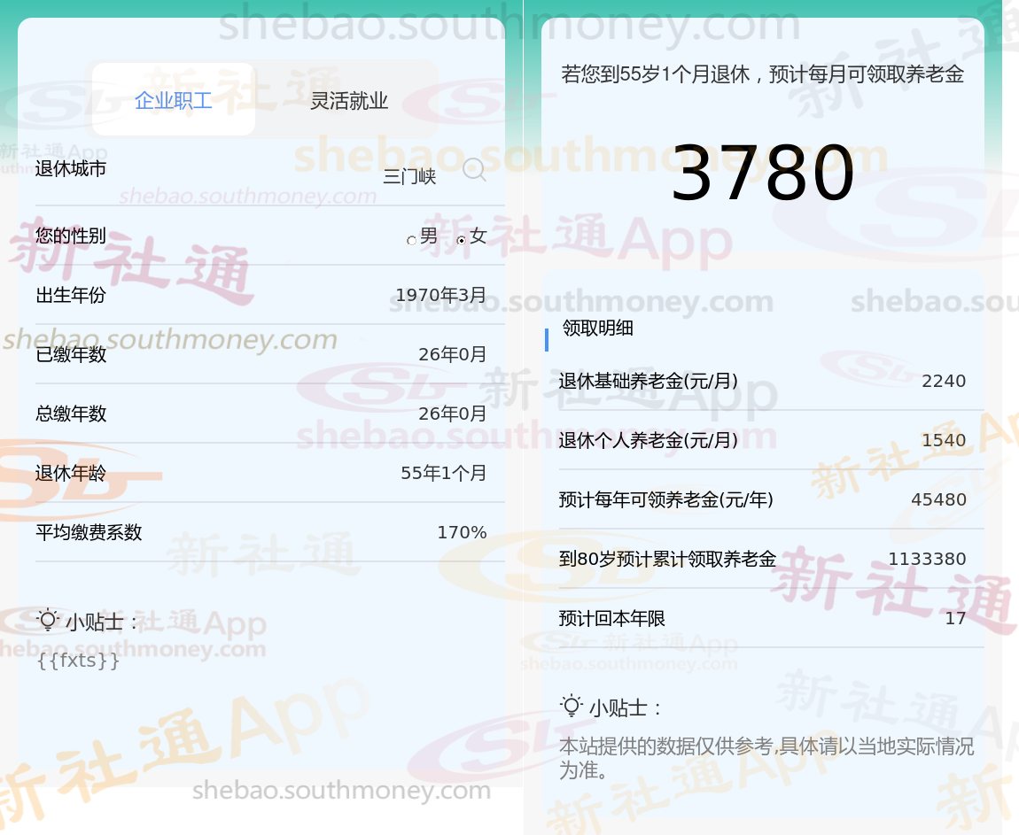 退休城市:三门峡,性别:女,出生年份:1970,总缴年数26年,缴费档次:170%,新社通app养老金计算器所得: