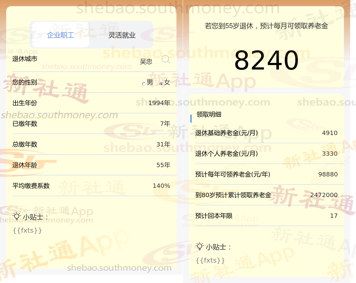 通过新社通APP-养老金计算所得:退休城市、出生年份、退休年龄、缴费系数都相同的情况下,社保缴费年限累计31年时,计算如下: