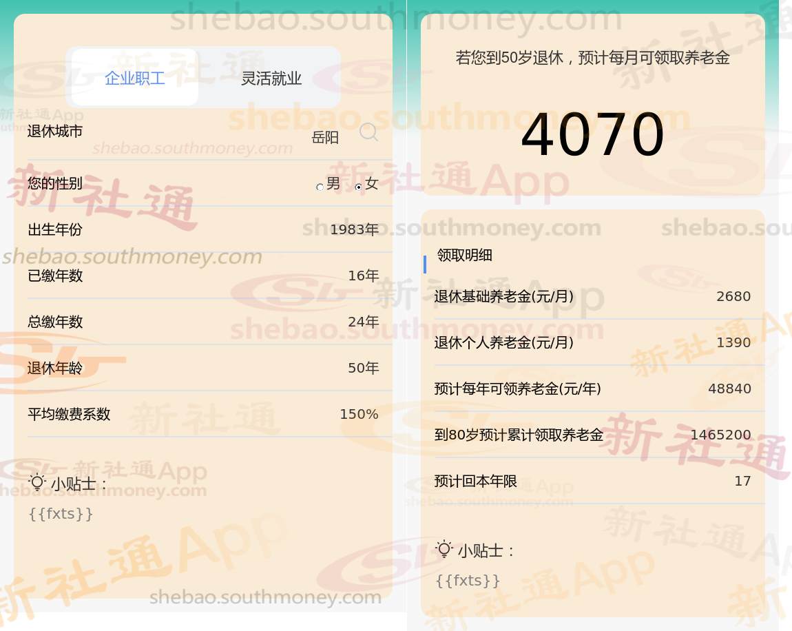 通过新社通APP-养老金计算所得:退休城市、出生年份、退休年龄、缴费系数都相同的情况下,社保缴费年限累计24年时,计算如下: