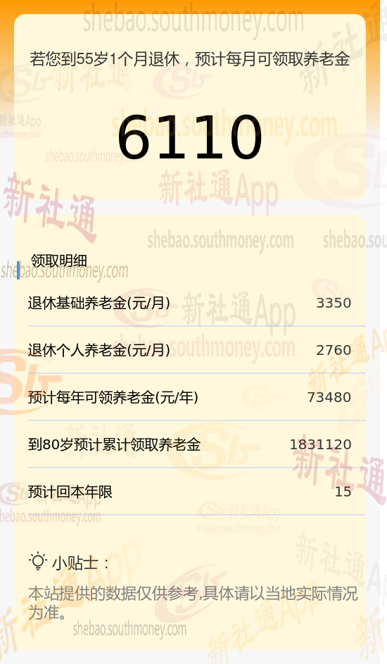新社通app养老金计算器所得出,每月领取6110元养老金。