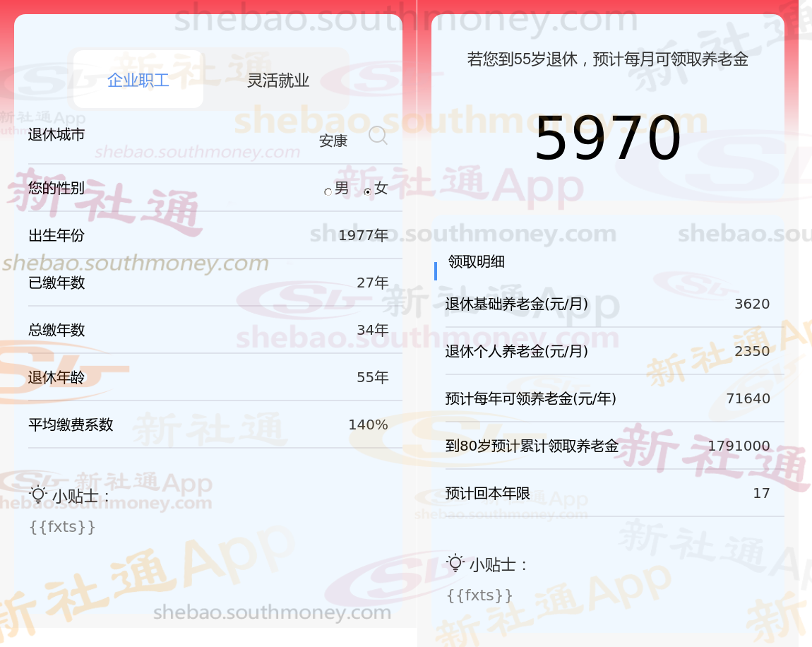 通过新社通APP-养老金计算所得:退休城市、出生年份、退休年龄、缴费系数都相同的情况下,社保缴费年限累计34年时,计算如下: