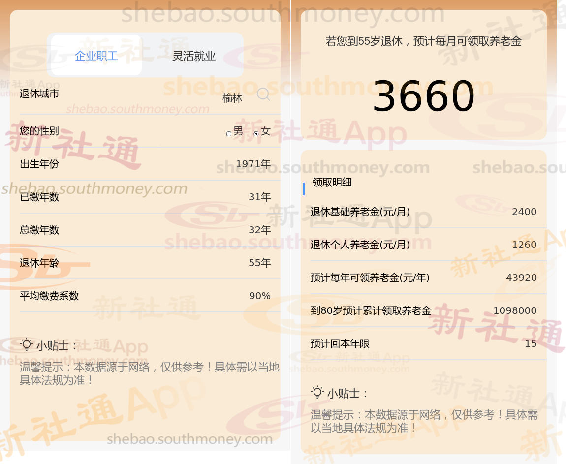 通过新社通APP-养老金计算所得:退休城市、出生年份、退休年龄、缴费系数都相同的情况下,社保缴费年限累计32年时,计算如下: