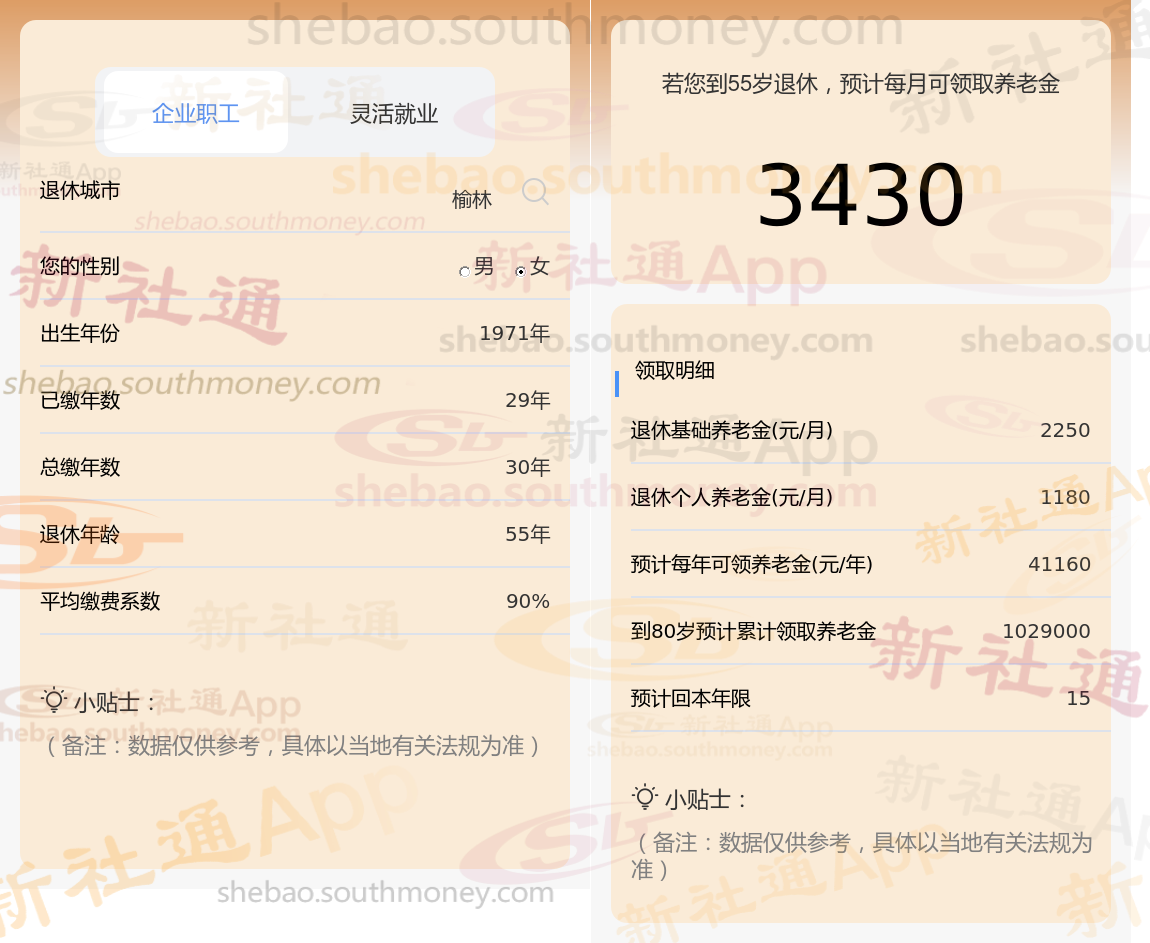 通过新社通APP-养老金计算所得:退休城市、出生年份、退休年龄、缴费系数都相同的情况下,社保缴费年限累计30年时,计算如下: