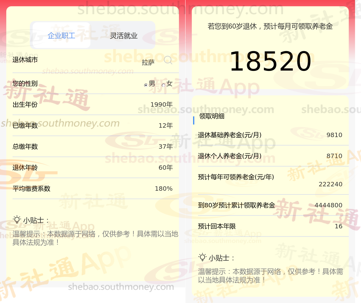 通过新社通APP-养老金计算所得:退休城市、出生年份、退休年龄、缴费系数都相同的情况下,社保缴费年限累计37年时,计算如下: