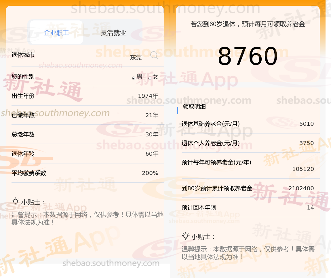 通过新社通APP-养老金计算所得:退休城市、出生年份、退休年龄、缴费系数都相同的情况下,社保缴费年限累计30年时,计算如下: