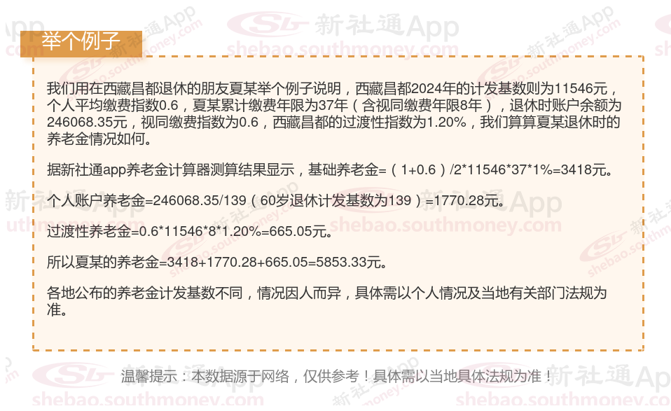 假设,参保人A是西藏昌都地区企业退休职工,其中参保人A工龄30年,视同缴费年限10年,视同缴费指数0.6。那么,根据消息显示,西藏昌都养老保险月缴费基数下限标准为6927.6元。2024西藏昌都城镇职工基本养老保险基本养老金计发基数确定为11546元。参保人60岁退休,退休时养老保险缴费指数0.6,据新社通app养老金计算器测算显示:退休之后每月分别所能领取的养老金为: