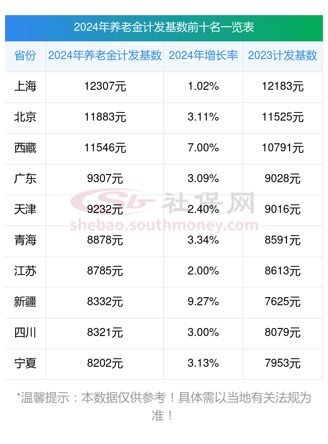 下面看看2023-2024年全国各地养老金计发基数排名前十