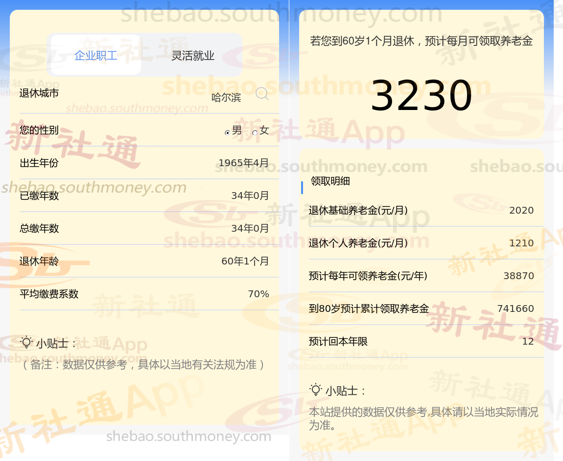 每月养老金总额 = 2020元 + 1210元 = 3230元。
